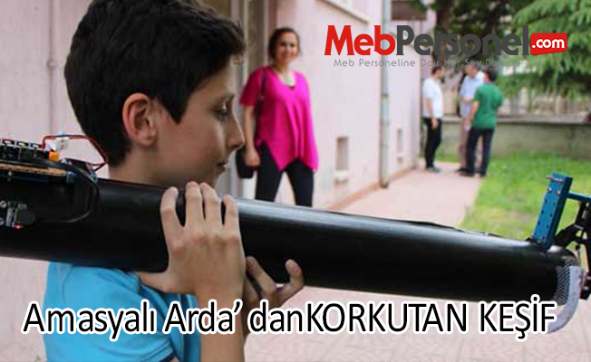 Amasya’da yaşayan 11 yaşındaki Arda Oymak’ın elma toplamakta güçlük çeken dedesi için yaptığı cihazı görenler roketatara benzetti.