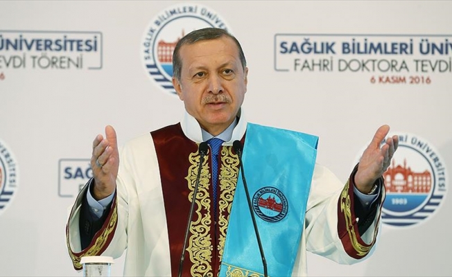 Erdoğan, Sağlık Bilimleri Üniversitesindeki Fahri Doktora Tevdi Töreni’nde yaptığı konuşmada, üniversite yönetimine, şahsına tevdi ettikleri fahri doktora unvanı için teşekkür etti.