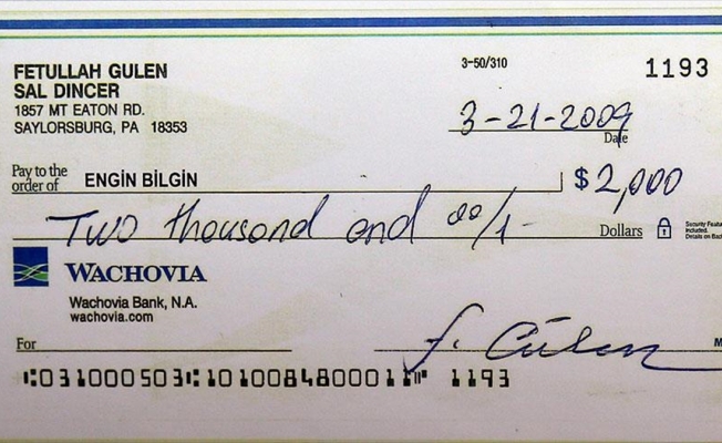 Çekin sağ tarafında seri numarası ile “3-21-2009” tarihi yer alıyor. “Engin B.” adına düzenlemiş, yazı ve rakamla “2 bin dolar” yazılı çekin sağ alt kısmında yer alan “F.GÜLEN” imzası dikkati çekiyor.