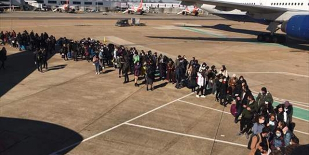 İçinde 348 öğrencinin olduğu Türk Hava Yollarına ait uçak, yerel saatle 13.40’ta (16.40) Londra’nın Gatwick Havalimanı’ndan hareket etti. Kalkıştan önce öğrencilere maske dağıtıldığı görüldü.