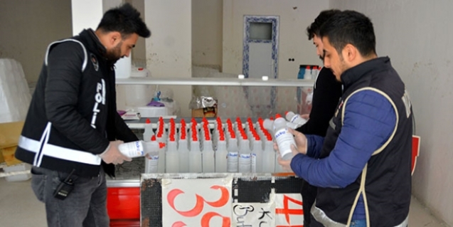 İş yerine baskın düzenleyen polis ekipleri, soğutma dolabı içinde, piyasaya sürülmek üzere şişelenmiş, sahte 3 bin 118 litre dezenfektan sprey, 2 bin 29 boş şişe, sahte etiket, alkol yoğunluk ölçer ve etil alkol ele geçirdi.