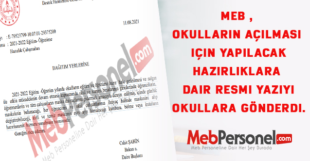 MEB Destek Hizmetleri Genel Müdürlüğü tarafından 81 il milli eğitim müdürlüğüne gönderilen 2021-2022 Eğitim- Öğretime Hazırlık Çalışmaları konulu resmi yazıda okulların eğitim ve öğretime hazır hale getirilmesi istendi.