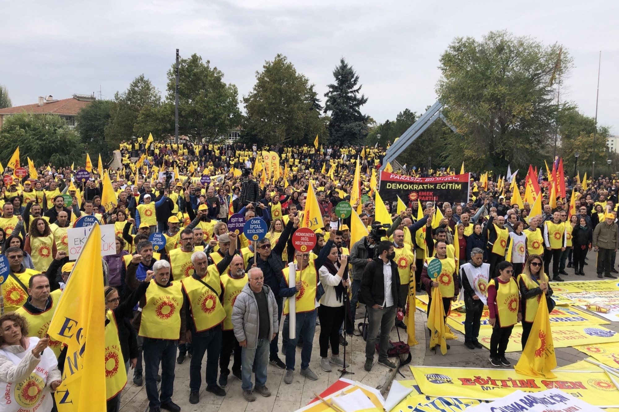 Eğitim Sen’in çağrısıyla ülkenin dört bir yanından binlerce öğretmen, Öğretmenlik Meslek Kanunu iptal edilmesi talebiyle Anıtpark’ta bir araya geldi. Öğretmenlerin tabandan yarattığı baskıyla 12 sendika sözde Öğretmenlik Meslek Kanunu’na karşı ortak mücadelenin ilk adımlarını attığını söyleyen Eğitim Sen Genel Başkanı Nejla Kurul, “İktidara her koşulda biat eden, eleştirmeyen, sorgulamayan ve bunun karşılığında adaylığı kalkan, kariyer basamaklarını tırmanan birer ‘memur öğretmen’ profili yaratmayı amaçlayan Öğretmenlik Meslek Kanunu’na karşı yükselen itirazlar daha fazla görmezden gelinmemelidir” dedi.