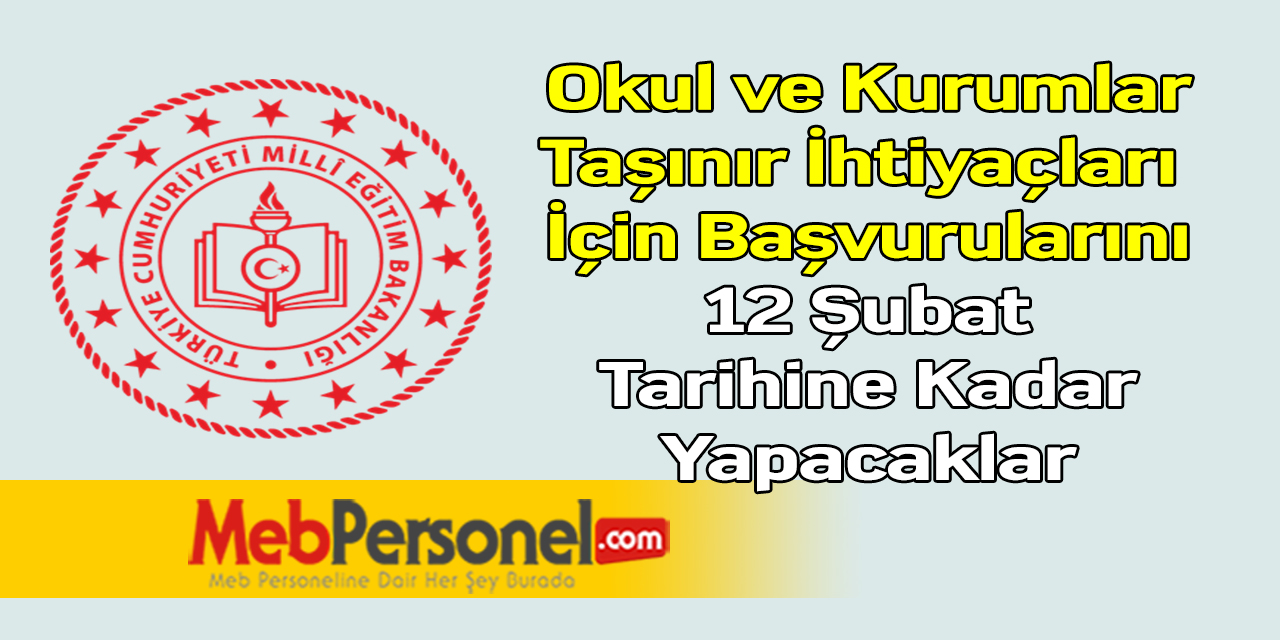 Okul ve kurumlar taşınır ihtiyaçlarını Mebbis e-Talep Modülü üzerinden 01 Şubat-12 Şubat 2021 tarihleri arasında yapacaklardır.