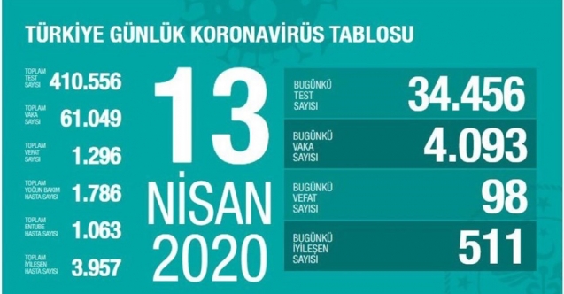 Bugün 34 bin 456 kişiye corona virüs testi yapılırken 4 bin 93 kişide daha corona virüs tespit edildi.