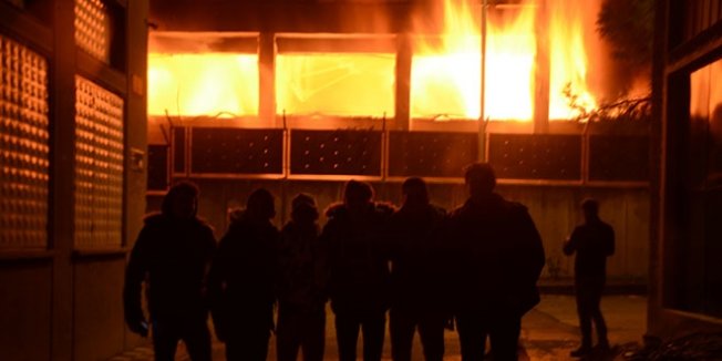 Bursa’da yeniden inşa edilmek üzere boşaltılan okulun kapalı spor salonunda yangın çıktı. Kısa sürede büyüyen alevler geceyi aydınlatırken bazı öğrenciler yanan kapalı spor salonunun önünde hatıra fotoğrafı çektirdi.