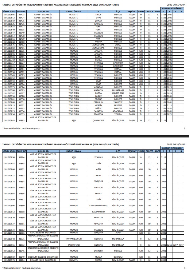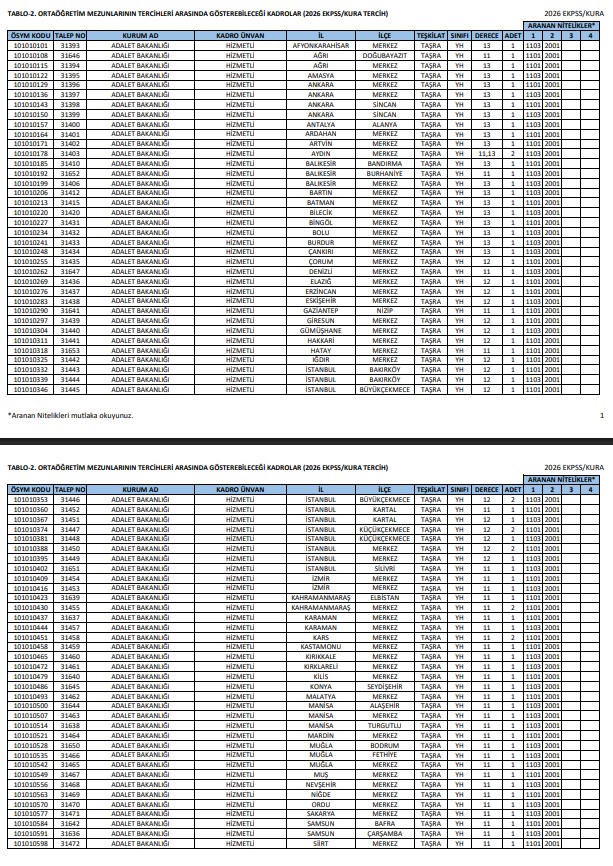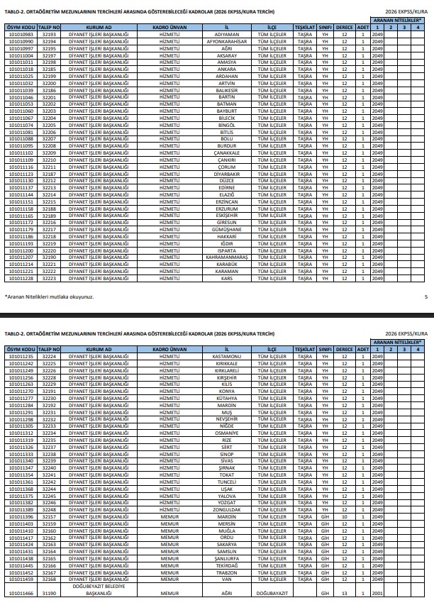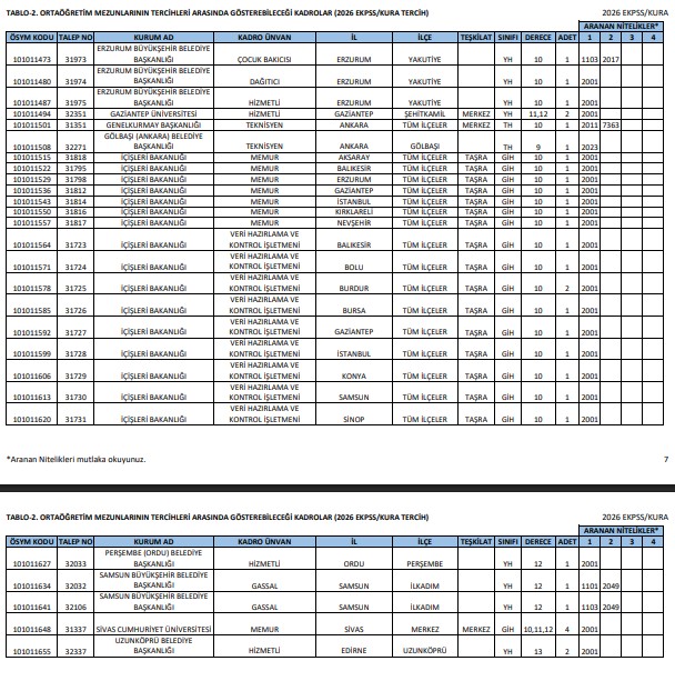 - TABLO-1. İlkokul ve ortaokul mezunlarının başvurabileceği kadrolar