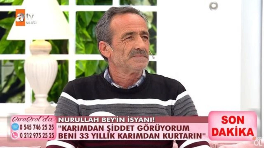 ATV ekranlarında yayınlanan Esra Erol’da programına başvuran Nurullah Erçelik, 33 yıllık eşi Vesile Erçelik’in şiddetine maruz kaldığını belirterek boşanmak istediğini söyledi. Eşine dava açtığını ancak anlaşmalı boşanamadığını söyleyen Erçelik, “Dünyayı bana zehir etti” diyerek isyan etti.