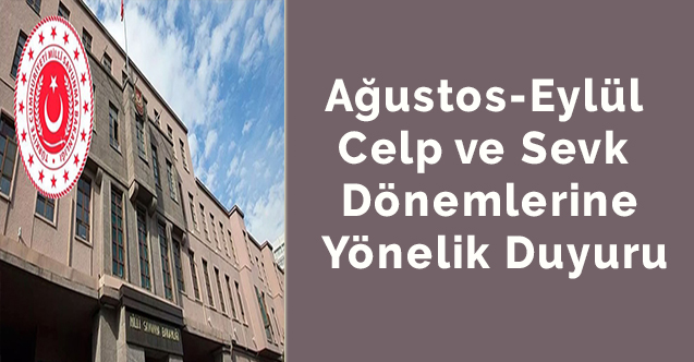 Ağustos/Eylül 2020 celp ve sevk dönemlerinde silahaltına alınacak yedek subay aday adayı, yedek astsubay aday adayı ile erbaş/er statüsündeki yükümlülere yönelik duyuru MSB Askeralma Genel Müdürlüğü internet sitesinde yayımlanmıştır.