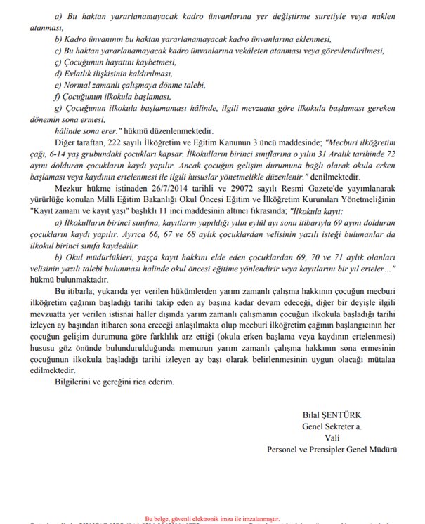 Yarı zamanlı çalışma hakkının çocuğun mecburi ilköğretim çağının başladığı tarihi takip eden ay başına kadar devam edeceği, diğer bir deyişle ilgili mevzuatta yer verilen istisnai haller dışında yarım zamanlı çalışmanın çocuğun ilkokula başladığı tarihi izleyen ay başından itibaren sona ereceği anlaşılması gerektiği, mecburi ilköğretim çağının başlangıcının her çocuğun gelişim durumuna göre farklılık arz ettiği (okula erken başlama veya kaydının ertelenmesi) hususu dikkate alındığında memurun yarım zamanlı çalışma hakkının sona ermesinin çocuğunun ilkokula başladığı tarihi izleyen ay başı olarak belirlenmesinin uygun olacağı ifade edilmiştir.
