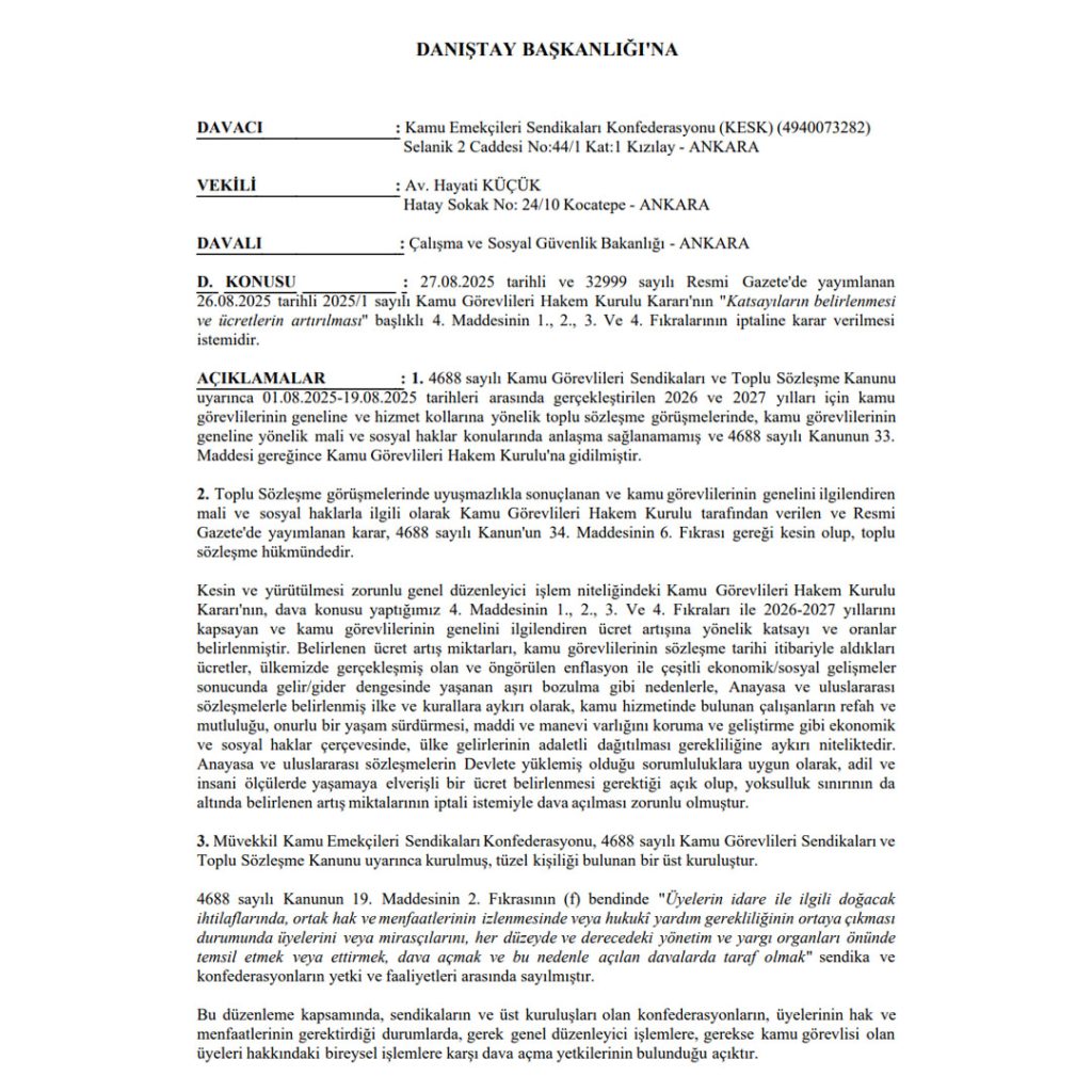 Kamu Emeklileri Sendikaları Konfederasyonu (KESK), 27 Ağustos 2025 tarihli Resmî Gazete'de yayımlanan ve 2026-2027 yıllarını kapsayan 2025/1 Sayılı Kamu Görevlileri Hakem Kurulu Kararı'na karşı yargı sürecini başlattı. KESK, davalı olarak Çalışma ve Sosyal Güvenlik Bakanlığı'nı göstererek, Karar'ın özellikle memur maaş ve ücretlerinin artırılmasına ilişkin hükümlerinin iptali için dava açtı. Açılan Dava Milyonlarca Kamu Görevlisini İlgilendiriyor Bu dava, milyonlarca kamu görevlisini yakından ilgilendiren ücret artış oranlarının yargı mercilerince yeniden değerlendirilmesi ihtimalini gündeme taşıyor. Davanın Gerekçesi: "Ekonomik Gelişmeler ve Yoksulluk Sınırı Dikkate Alınmadı" Uzlaşmazlık ve Hakem Kurulu Süreci: 1-25 Ağustos 2025 tarihleri arasında gerçekleştirilen 2026 ve 2027 yıllarını kapsayan toplu sözleşme görüşmelerinde uzlaşma sağlanamaması üzerine konunun Kamu Görevlileri Hakem Kurulu'na gittiği belirtildi.
