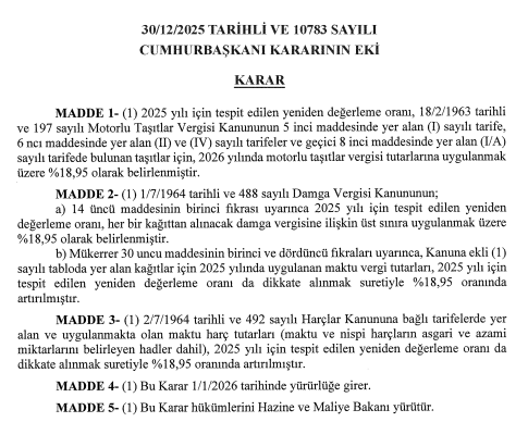 Kararın 1. maddesine göre, 2025 yılı için tespit edilen yeniden değerleme oranı; Motorlu Taşıtlar Vergisi Kanunu kapsamında yer alan otomobil, motosiklet ve diğer taşıt grupları için 2026 yılında %18,95 olarak uygulanacak.