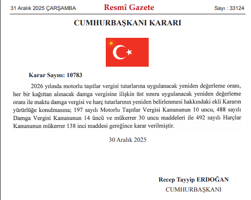 31 Aralık 2025 tarihli Resmî Gazete’de yayımlanan Cumhurbaşkanı Kararı ile 2026 yılında uygulanacak Motorlu Taşıtlar Vergisi (MTV), damga vergisi ve harç tutarlarına ilişkin yeniden değerleme oranları netleşti. 31 Aralık 2025 tarihiyle yayımlanan 33124 sayılı Resmî Gazete’de yer alan 10783 sayılı Cumhurbaşkanı Kararı, milyonlarca araç sahibini ve mükellefi yakından ilgilendiriyor. Cumhurbaşkanı Recep Tayyip Erdoğan’ın imzasıyla yürürlüğe giren karara göre, 2026 yılı için geçerli olacak vergi ve harç güncellemeleri belirlendi.