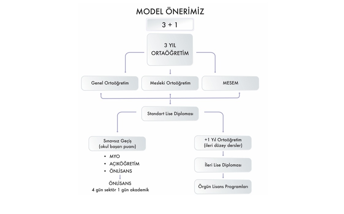 Düşünce kuruluşu TEDMEM tarafından önerilen "3+1 Ortaöğretim Modeli," 12 yıllık zorunlu eğitimin süresini değil, niteliğini odak noktasına almayı hedefliyor. Modelde öğrenciler, 3 yıllık temel lise eğitimini (Genel, Mesleki veya MESEM) tamamladıktan sonra Standart Lise Diploması alıyor ve kariyerlerine yönelik iki farklı yol seçeneğine sahip oluyor: İstihdama katılmak, MYO veya önlisans programlarına sınavsız geçiş yapmak ya da lisans hedefi için ileri düzey derslerin verildiği isteğe bağlı 12. uzmanlaşma yılını okuyarak İleri Lise Diploması almak.