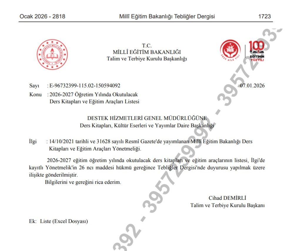 Resmi Yazı Millî Eğitim Bakanlığı Talim ve Terbiye Kurulu Başkanlığı tarafından 7 Ocak 2026 tarihinde yayımlanan resmi yazıya göre, 2026-2027 eğitim-öğretim yılında okutulacak ders kitapları ve eğitim araçlarının listesi belirlenerek kamuoyuna duyurulmak üzere Tebliğler Dergisi'nde yayımlandı. Kurul Başkanı Cihad Demirli imzasıyla yayımlanan ve ilgili yönetmeliğin 26. maddesine dayandırılan karar kapsamında, önümüzdeki dönemin tüm temel ve yardımcı eğitim materyalleri netleşirken; söz konusu liste, basım ve dağıtım süreçlerinin yönetilmesi amacıyla Destek Hizmetleri Genel Müdürlüğü’ne bağlı Ders Kitapları, Kültür Eserleri ve Yayımlar Daire Başkanlığına resmen iletildi.