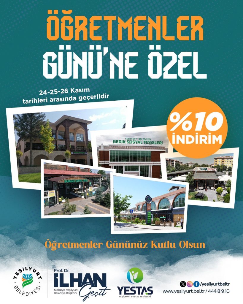 "Değerli öğretmenlerimiz için küçük bir teşekkür… Geleceğimizi emanet ettiğimiz, sabır ve fedakârlıklarıyla hayatımıza yön veren tüm öğretmenlerimizin Öğretmenler Günü’nü şimdiden kutluyoruz. 24-25-26 Kasım tarihlerinde Yeşilyurt Sosyal Tesislerimizde %10 indirimle siz değerli öğretmenlerimize teşekkür ediyoruz."