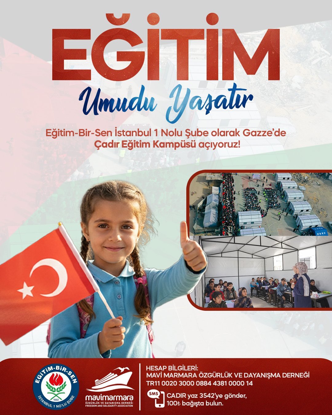 Gazze’de iki yılı aşkın süredir devam eden saldırılar; sadece binaları değil, çocukların hayallerini, umutlarını ve geleceğini de hedef aldı. Yüzlerce okul yıkıldı, ayakta kalanlar ise barınma merkezlerine dönüştü. Bugün Gazze’de eğitim, en derin yaralardan biri hâline gelmiş durumda. Bu karanlığın içinde bir umut ışığı yakmak için Eğitim Bir-Sen İstanbul 1 Nolu Şubesi tarafından, Mavi Marmara Derneği iş birliğiyle ve Gazze Eğitim ve Yükseköğretim Bakanlığı ile koordinasyon hâlinde “Çadır Eğitim Kampüsü” inşa edilecek. Bu proje; bombalar altında büyümek zorunda kalan çocukların yeniden kalemle, defterle ve umutla buluşmasını amaçlıyor. *Çadır Eğitim Kampüsü bünyesinde:* * Eğitim çadırları * Anaokulu * Mescid * Çok amaçlı çadır alanları yer alacak. Bu kampüs, yalnızca bir eğitim alanı değil; çocukların yeniden gülümseyebileceği, güvenle öğrenebileceği ve geleceğe tutunabileceği bir umut mekânı olacak. Gazze’de eğitimin yeniden ayağa kalkması için yürüttüğümüz bu hayırlı çalışmada sizlerin desteği, duası ve paylaşımı bizim için çok kıymetli olduğu Eğitim Bir Sen 1 Nolu Şubesi tarafından ayrıca ifade edilmektedir. Bağış için HESAP BİLGİLERİ: MAVİ MARMARA ÖZGÜRLÜK VE DAYANIŞMA DERNEĞİ TR11 0020 3000 0884 4381 0000 14 CADIR yaz 3542 ye gönder, 100₺ bağışta bulun.