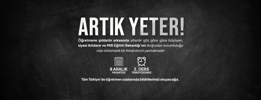 Eğitim-İş Sendikası, öğretmene yönelik şiddetin sistematik ihmallerden kaynaklandığını belirterek, bu duruma dikkat çekmek amacıyla 8 Aralık 2025 tarihinde tüm Türkiye’deki öğretmen odalarında ortak bildiri okunacağını duyurdu. Eğitim sendikasının kararı doğrultusunda, 8 Aralık 2025 Pazartesi günü, ikinci ders teneffüsü sırasında tüm Türkiye genelindeki öğretmen odalarında işyeri temsilcileri tarafından ortak bildiriler okunacaktır. Ülke Geneli Eylem Kararı Eğitim-İş Sendikası, öğretmenlere yönelik artan şiddet olaylarına yazılı bir açıklamayla sert tepki gösterdi. Sendika, şiddet olaylarının ‘tesadüf değil, yıllardır süren sistematik bir ihmalin sonucu’ olduğunu savunarak, öğretmenlerin hedef gösterilmesinin, mesleğin saygınlığının aşındırılmasının ve güvencesiz çalışma koşullarının şiddet ortamını beslediğini belirtti. Eğitim-İş, bu duruma karşı “Biz bu düzeni kabul etmiyoruz” diyerek tepkisini netleştirdi. İşte Yapılan Açıklama