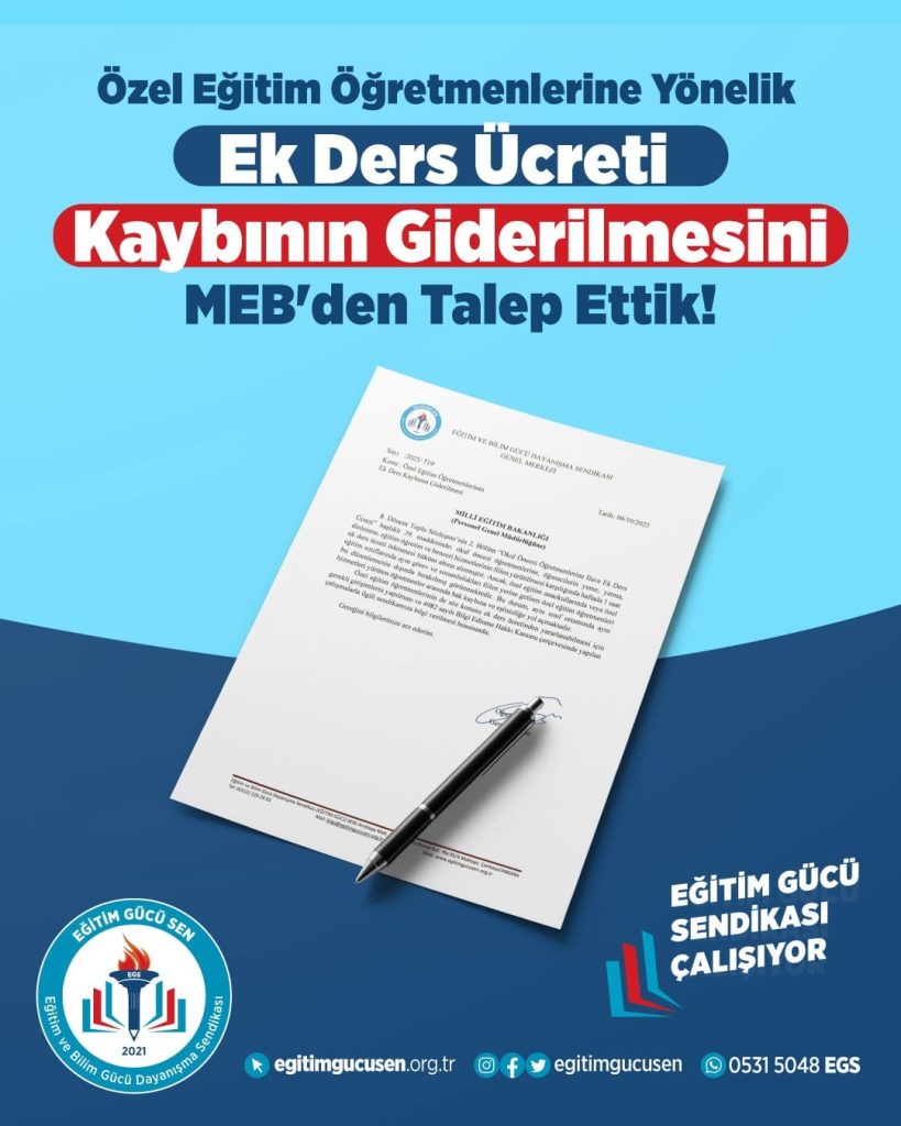 Eğitim Gücü Sen sendikası, 8. Dönem Toplu Sözleşme ile okul öncesi öğretmenlerine tanınan ek ders ücreti hakkının özel eğitim öğretmenlerine de verilmesi için Milli Eğitim Bakanlığı'na (MEB) çağrı yaptı. Sendika, aynı sorumlulukları fiilen yerine getiren özel eğitim öğretmenlerinin kapsam dışında bırakılmasının gelir eşitsizliği ve haksızlık yarattığını belirtti. "Fiili Görev Eşitliği, Ücret Eşitliği Getirmeli" Sendika, özel eğitim öğretmenlerinin de öğrencilerin bakım, beslenme ve dinlenme süreçlerinde aktif rol aldığını belirterek, bu durumun iki öğretmen grubu arasında adaletsiz bir gelir farkı oluşturduğunun altını çizdi. Eğitim Gücü Sen Genel Başkanı Oğuz Özat X sosyal medya hesabı üzerinden yaptığı paylaşımda şu ifadeleri kullandı. "8. Dönem Toplu Sözleşme’de okul öncesi öğretmenlerine öğrencilerin yeme, yatma, dinlenme gibi hizmetleri yürütmeleri karşılığında haftada 1 saat ek ders ücreti ödenmesi kararlaştırılmıştır. Ancak, aynı görev ve sorumlulukları fiilen yerine getiren özel eğitim öğretmenleri bu düzenlemeden yararlanamamaktadır. Bu durum, öğretmenler arasında haksızlığa ve gelir eşitsizliğine neden olmaktadır. Bu nedenle, özel eğitim öğretmenlerinin de bu ek ders ücretinden faydalanabilmesi için gerekli düzenlemelerin yapılmasını MEB’den talep ettik."