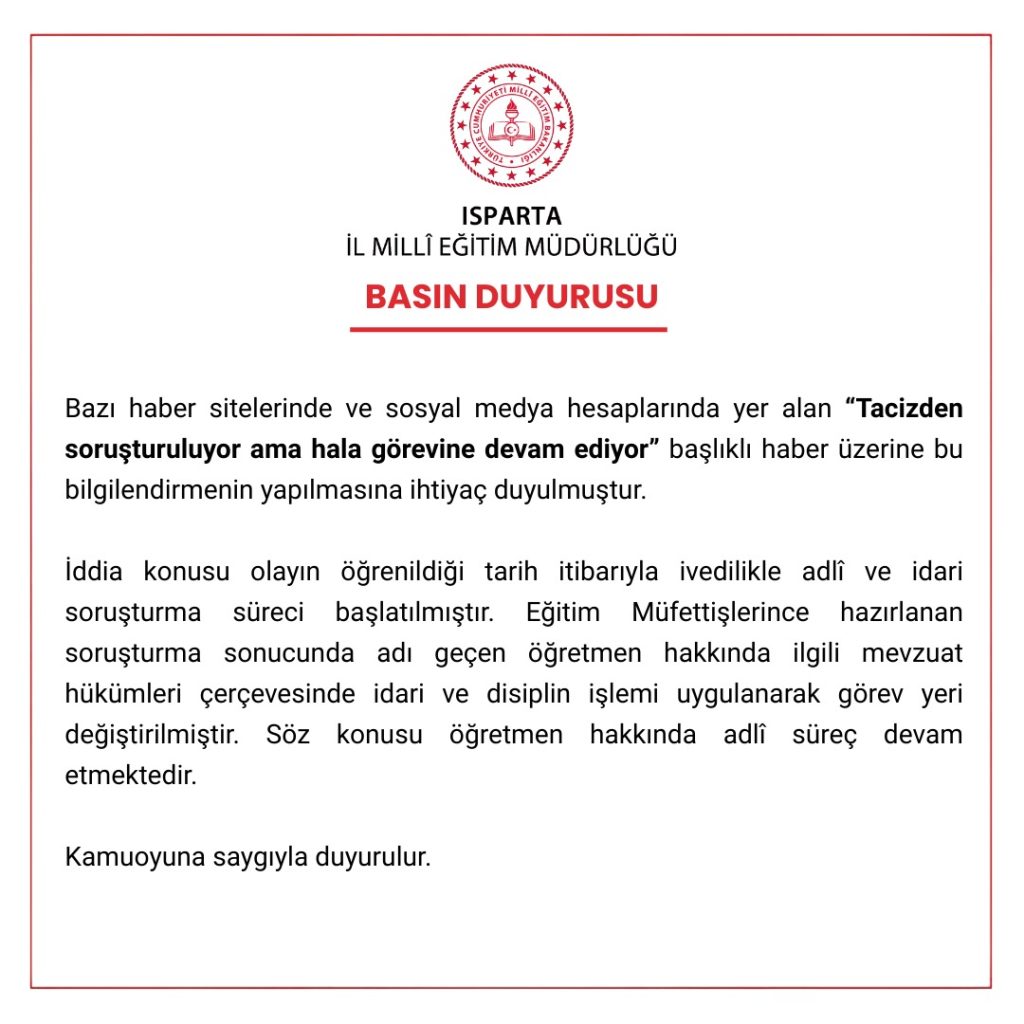 Isparta İl Milli Eğitim Müdürlüğü, bazı haber siteleri ve sosyal medya hesaplarında yer alan "Tacizden soruşturuluyor ama hala görevine devam ediyor" başlıklı haberler üzerine resmi bir bilgilendirme yaptı. Yayınlanan basın duyurusunda, iddia konusu olayın öğrenildiği tarihten itibaren ivedilikle adli ve idari soruşturma süreci başlatıldığı belirtildi.