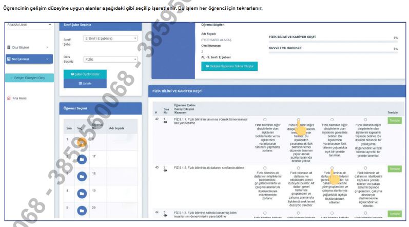 Hazırlık sınıfı düzeyinde • Türk Dili ve Edebiyatı • Matematik • İngilizce • Müzik • Beden Eğitimi • Görsel Sanatlar 9. sınıf düzeyinde • Türk Dili ve Edebiyatı • Matematik • Fizik • Kimya • Tarih • Biyoloji • Coğrafya • İngilizce • Müzik • Beden Eğitimi • Görsel Sanatlar • Din Kültürü ve Ahlak Bilgisi 10. sınıf düzeyinde • Türk Dili ve Edebiyatı • Matematik • Fizik • Kimya • Tarih • Biyoloji • Coğrafya • Felsefe • Din Kültürü ve Ahlak Bilgisi Gelişim Raporları Nasıl Doldurulacak?
