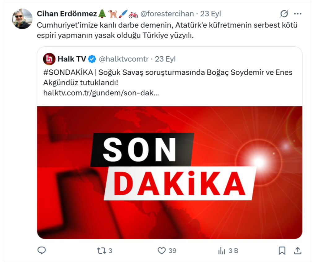 https://istanbulakademi.meb.gov.tr/SysOs201.php?pID=1426 İstanbul, milyonlarca öğrenci ve on binlerce öğretmenin görev yaptığı Türkiye’nin en büyük eğitim kenti. Böyle bir şehirde öğretmenlere eğitim verecek kişilerin belirlenmesi, titizlik ve tarafsızlık gerektiren bir süreç olmalı. Ancak görünen o ki, İstanbul İl Millî Eğitim Müdürü Mücahit Yentür’ün yönettiği bu süreçte özen ve hassasiyet yerini sıradanlığa ve denetimsizliğe bırakmış durumda. Kamuoyunun haklı sorusu şu: Bu isimler kim tarafından, hangi ölçütlerle seçiliyor? Eğitmen, Siyasi Paylaşımlarıyla Gündemde Söz konusu eğitmen Doç. Dr. Cihad Erdönmez’in, Yeşil Gazete’de yayımlanan “Toplumsal çürümeye ekolojik bir bakış” başlıklı yazısında, siyaseti doğrudan hedef alan ifadeler kullandığı görülüyor. Erdönmez yazısında, “Devletin tepesindeki kişi milyonlarca kadına ‘sürtük’ deme serbestliğine sahipken bir sanatçı sahne arkadaşına içinde ‘sapık’ sözcüğü geçen bir şaka yaptığı için gözaltına alınabiliyor...” ifadelerini kullanıyor.