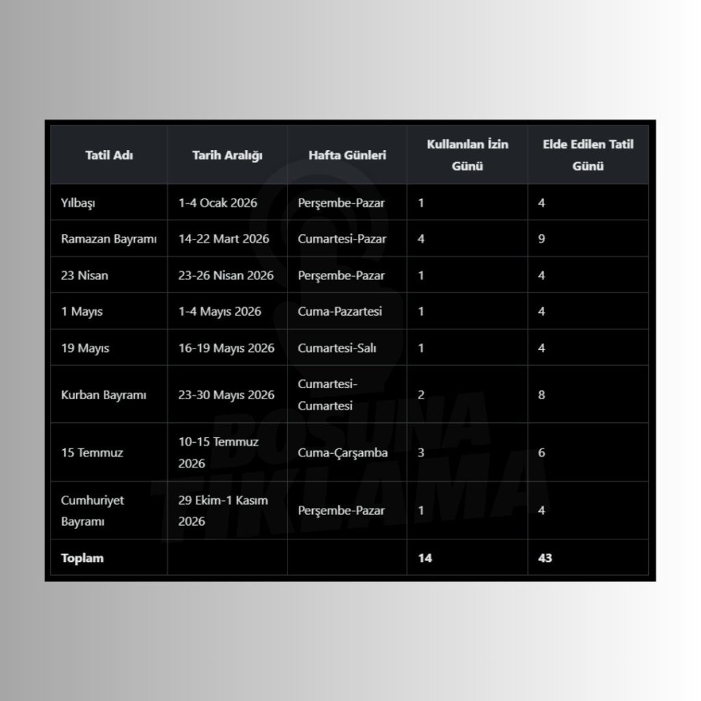 14 GÜN İZİNLE 43 GÜN TATİL 1 Ocak 2026 Perşembe (Yılbaşı): Yılın ilk tatil günü, bir Cuma günü izinle 4 günlük uzun bir dinlenme fırsatı sunuyor. Ramazan Bayramı: 14-22 Mart tatil hafta sonu tatilleriyle birlikte alınacak 4 günle 9 gün tatil23 Nisan 2026 Perşembe (Ulusal Egemenlik ve Çocuk Bayramı): Okul döneminin en kritik tatillerinden biri olan 23 Nisan, Perşembe gününe denk gelerek, Cuma günü izinle 4 günlük bir bahar kaçamağı yaratıyor. 1 Mayıs 2026 Cuma (İşçi Bayramı): Hafta sonuyla birleşen 1 Mayıs Cuma günü, öğretmen ve öğrenciler için izinsiz 3 günlük kesintisiz bir mola anlamına geliyor. 9 Mayıs 2026 Salı (Atatürk’ü Anma, Gençlik ve Spor Bayramı): Pazartesi günü (18 Mayıs) tek gün izin kullanarak, bu tatili de 4 güne uzatmak mümkün olacak. Kurban Bayramı: 27 Mayıs Kurban Bayramı Kurban Bayramında alınaca iki günlük izinle 23-30 Mayıs Hafta Sonuyla birleşmesiyle 8 gün tatil 15 Temuz Demokrasi ve Milli Birlik Günü: 15 Temmuz 2026 Çarşamba Çarşamba alınacak 2 günlük izinle 6 gün tatil yapılabilecek 29 Ekim Cumhuriyet Bayramı: 2026 yılında 29 Ekim Cumhuriyet Bayramı Perşembe günü alınacak 1 gün izinle 4 gün tatil