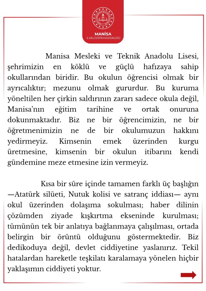 Manisa İl Milli Eğitim Müdürlüğü (Manisa MEM), son günlerde Manisa Mesleki ve Teknik Anadolu Lisesi'ne yönelik basında yer alan iddialara karşı kamuoyu açıklaması yayımladı. Satranç İddiası Yalanlandı Okulda uzun yıllardır faaliyet gösteren Satranç Kulübü'nün bulunduğu ve öğrencilerin turnuvalara katıldığı belirtilerek, "satranç yasaklandı" iddiasının iftira ve karalama girişimi olduğu ifade edildi. Kütüphane İddiası "Kütüphane kapatıldı" söyleminin ciddiye alınacak bir tarafı bile olmadığı, maksatlı tartışma üretme çabası olduğu vurgulandı. Nutuk Konusu Temizlik sırasında kolilerin karışması sonucu kitapların dışarı çıkarıldığı, idarenin derhal müdahale ettiği ve kitapların çöpe atılmasının söz konusu olmadığı açıklandı. Bu durumun, kurumu töhmet altında bırakma çabası olduğu belirtildi. Atatürk Silüeti Tartışma konusu yapılan silüetin 43 yıl önce öğrenciler tarafından yapılmış, okulun kültürel hafızasına kazınmış bir eser olduğu, konunun kışkırtıcı başlıklarla gündeme getirildiği belirtildi. Bizim rehberimiz tartışma değil; saha, ilim ve ölçümdür, Manisa MEM, kurgu ve dedikoduya izin vermeyeceklerini, kurumun emeğini ve itibarını koruyacaklarını vurgulayarak, "Bizim rehberimiz tartışma değil; saha, ilim ve ölçümdür," mesajını verdi. Müdürlük, hakikati eğip bükerek kimsenin Manisa eğitim camiasının emeğini gölgelemesine izin vermeyeceklerini belirterek, "Gelecek çok güzel gelecek" çünkü işlerini ciddiyet ve kararlılıkla yaptıklarını dile getirdi. İşte Basın Açıklaması;