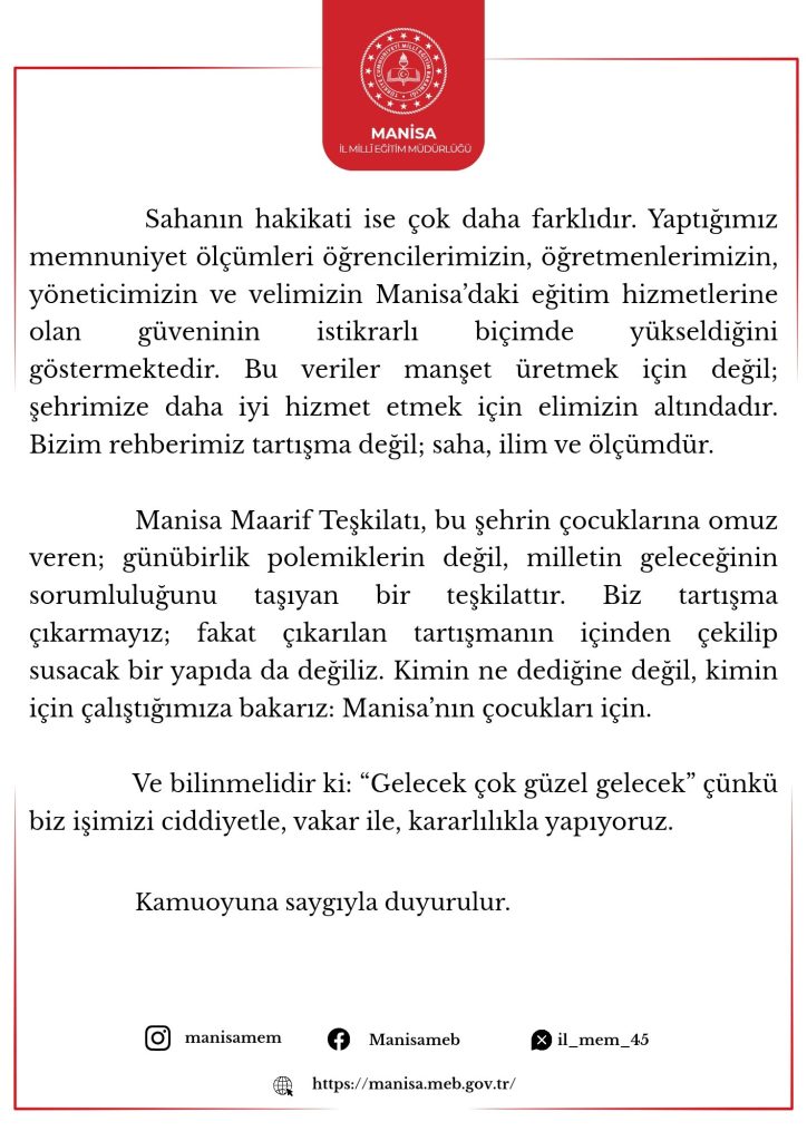 Manisa İl Milli Eğitim Müdürlüğü 'nden Basın Açıklaması: "Kimsenin Manisa Maarifin Emeğini Gölgelenmesine İzin Vermeyiz"