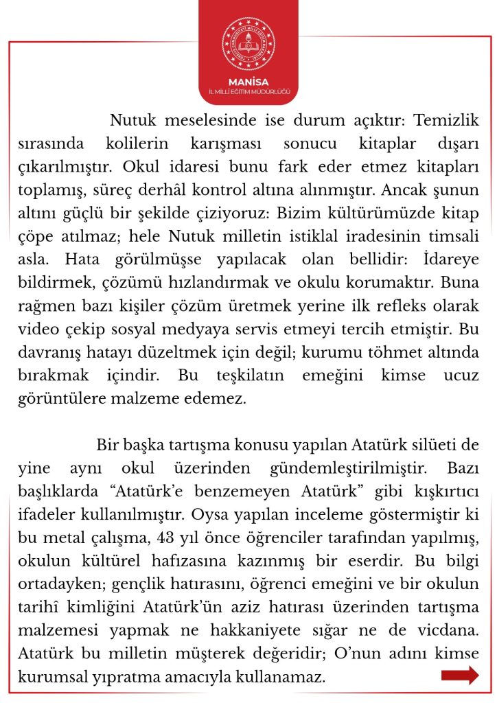 Manisa MEM, kurgu ve dedikoduya izin vermeyeceklerini, kurumun emeğini ve itibarını koruyacaklarını vurgulayarak, “Bizim rehberimiz tartışma değil; saha, ilim ve ölçümdür,” mesajını verdi. Müdürlük, hakikati eğip bükerek kimsenin Manisa eğitim camiasının emeğini gölgelemesine izin vermeyeceklerini belirterek, “Gelecek çok güzel gelecek” çünkü işlerini ciddiyet ve kararlılıkla yaptıklarını dile getirdi.