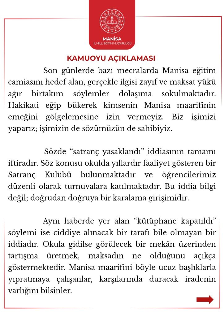 Okulda uzun yıllardır faaliyet gösteren Satranç Kulübü’nün bulunduğu ve öğrencilerin turnuvalara katıldığı belirtilerek, “satranç yasaklandı” iddiasının iftira ve karalama girişimi olduğu ifade edildi.