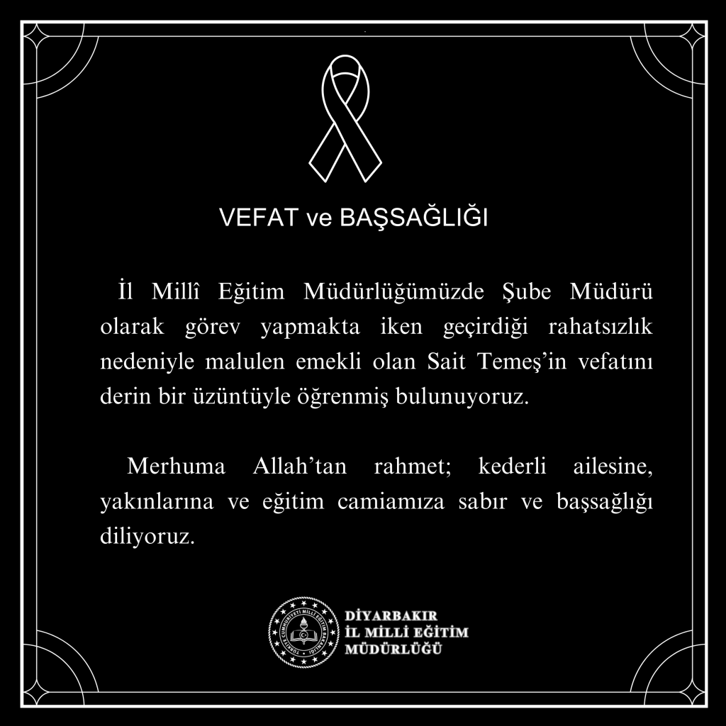 Diyarbakır İl Millî Eğitim Müdürlüğü Başsağlığı Mesajı Yayınladı "Vefat ve Başsağlığı İl Millî Eğitim Müdürlüğümüzde Şube Müdürü olarak görev yapmakta iken geçirdiği rahatsızlık nedeniyle malulen emekli olan Sait Temeş’in vefatını derin bir üzüntüyle öğrenmiş bulunuyoruz. Merhuma Allah’tan rahmet; kederli ailesine, yakınlarına ve eğitim camiamıza sabır ve başsağlığı diliyoruz."
