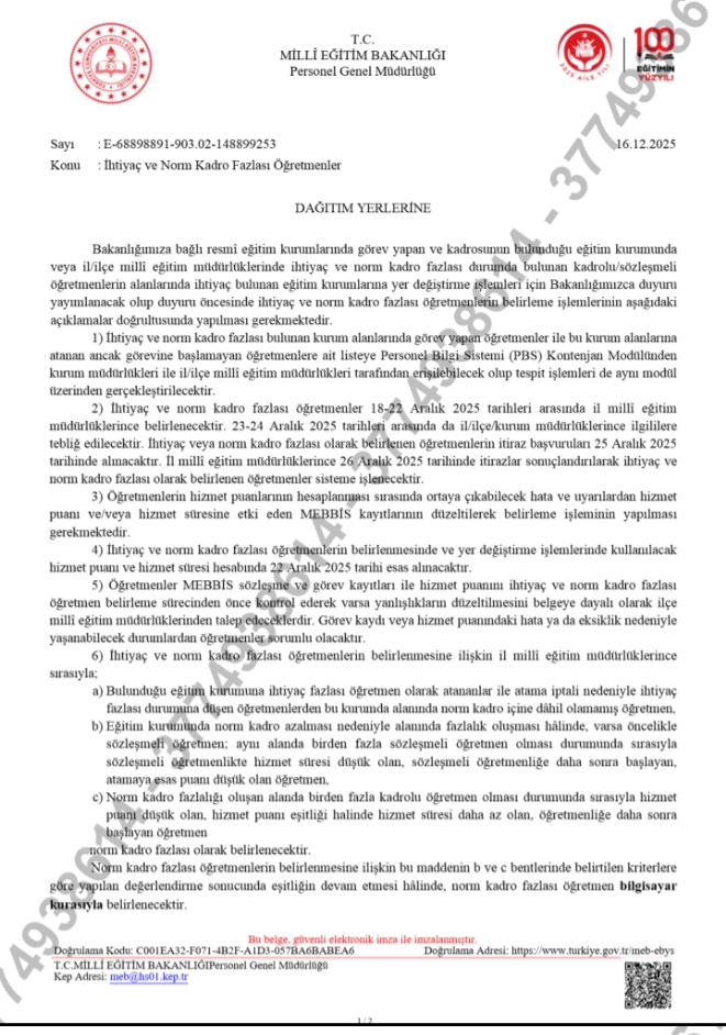 Millî Eğitim Bakanlığı (MEB) Personel Genel Müdürlüğü, tüm il millî eğitim müdürlüklerine gönderdiği 16.12.2025 tarihli resmi yazı ile (Sayı: E-65889891-903.02-148899253) eğitim kurumlarındaki öğretmen ihtiyacı ve norm kadro fazlalığı durumunun yeniden belirlenmesi için detaylı bir sürecin başlatıldığını duyurdu.