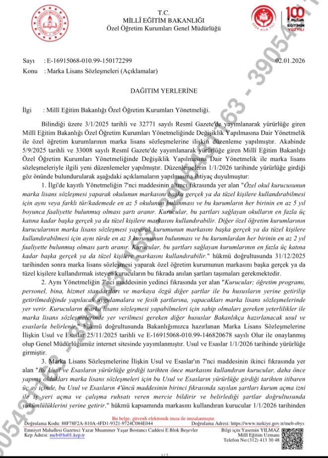 Milli Eğitim Bakanlığı, özel öğretim kurumlarının marka kullanımı ve lisans sözleşmelerine yönelik standartları belirleyen yeni düzenlemeyi hayata geçirdi. 1 Ocak 2026 itibarıyla yürürlüğe giren kurallar, marka kiralayan ve kullanan kurumlar için sıkı denetimler getiriyor.