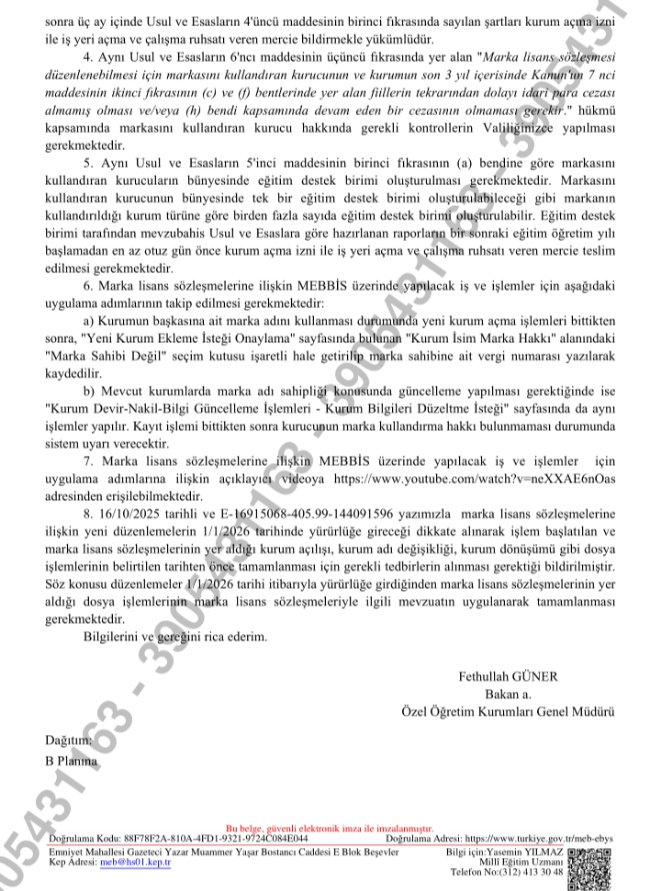 Eğitim Destek Birimi Zorunluluğu Markasını kullandıran kurucuların bünyesinde artık bir "Eğitim Destek Birimi" oluşturulması zorunlu olacak. Bu birim, markanın kullanıldığı kurumların eğitim kalitesini denetleyecek ve hazırlanan raporlar her yıl eğitim-öğretim yılı başlamadan en az 30 gün önce ilgili mercilere teslim edilecek. MEBBİS Üzerinden Dijital Takip Marka lisans sözleşmelerine ilişkin tüm iş ve işlemler MEBBİS üzerinden yürütülecek. Yeni kurum açılışlarında veya mevcut kurumların marka güncellemelerinde, sistem üzerinden "Marka Sahibi Değil" seçeneği işaretlenerek marka sahibinin vergi numarası kaydedilecek. Hak sahibi olmadığı halde marka kullanan kurumlar için sistem uyarı verecek. Geçiş Süreci İçin Son Tarihler 1 Ocak 2026'dan önce marka kullanan kurumlara, yeni şartlara uyum sağlamaları için 3 ay süre tanındı. Bu süre zarfında şartları yerine getirmeyen veya bildirimde bulunmayan kurumların durumları yeniden değerlendirilecek.