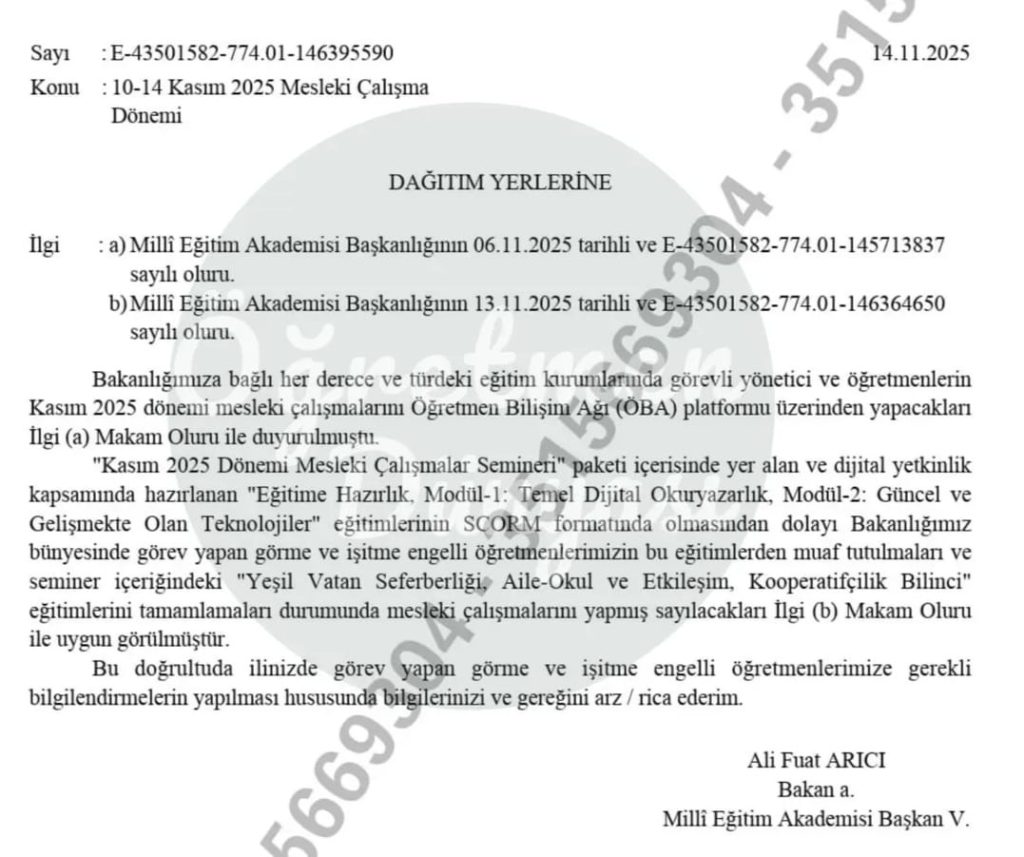 Yazıda, mesleki çalışmaların temelini oluşturan "Kasım 2025 Dönemi Mesleki Çalışmalar Semineri" paketindeki dijital yetkinlik ve gelişimle ilgili bazı eğitimlerin SCORM formatında olmasından dolayı, görme ve işitme engelli öğretmenlere yönelik bir muafiyet getirildiği belirtildi.