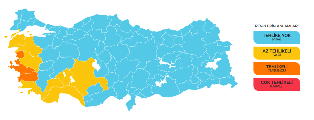 Marmara’nın güneyinden başlayarak iç Ege ve Batı Akdeniz’e kadar uzanan geniş bir bölge ise “Az Tehlikeli” anlamına gelen Sarı kodla işaretlendi. Bu bölgelerde risk, kıyı şeridine oranla daha düşük olsa da yerel olumsuzluklara karşı hazırlıklı olunması öneriliyor.