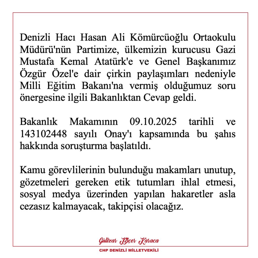 CHP Denizli Milletvekili Gülizar Biçer Karaca'nın, bir okul müdürünün tartışmalı sosyal medya paylaşımlarını Meclis gündemine taşıdığı soru önergesine Milli Eğitim Bakanlığı'ndan yanıt geldi. Bakanlık, söz konusu okul müdürü hakkında inceleme ve soruşturma başlatıldığını resmen bildirdi. Soru Önergesi Bakanlığa Sunuldu Milletvekili Karaca, Bakan Yusuf Tekin'e sunduğu önergede, "Okul müdürü gibi kamu görevlisi konumundaki birinin tarafsızlık ve devlet memurluğu ilkelerini ihlal eden bu paylaşımları, eğitim camiası açısından derin kaygı yaratmaktadır" sözleriyle eleştirisini dile getirdi. CHP Denizli Milletvekili Gülizar Biçer Karaca X sosyal medya hesabından yaptığı paylaşımla duyurdu; "Denizli Hacı Hasan Ali Kömürcüoğlu Ortaokulu Müdürü'nün Partimize, ülkemizin kurucusu Gazi Mustafa Kemal Atatürk'e ve Genel Başkanımız Özgür Özel'e dair çirkin paylaşımları nedeniyle Milli Eğitim Bakanı'na vermiş olduğumuz soru önergesine Bakanlıktan Cevap geldi. Bakanlık Makamının 09.10.2025 tarihli ve 143102448 sayılı Onay'ı kapsamında ilgili şahıs hakkında soruşturma başlatıldı. Kamu görevlilerinin bulunduğu makamları unutup, gözetmesi gereken etik tutumları ihlal etmesi, sosyal medya üzerinden yapılan hakaretler asla cezasız kalmayacak, takipçisi olacağız."