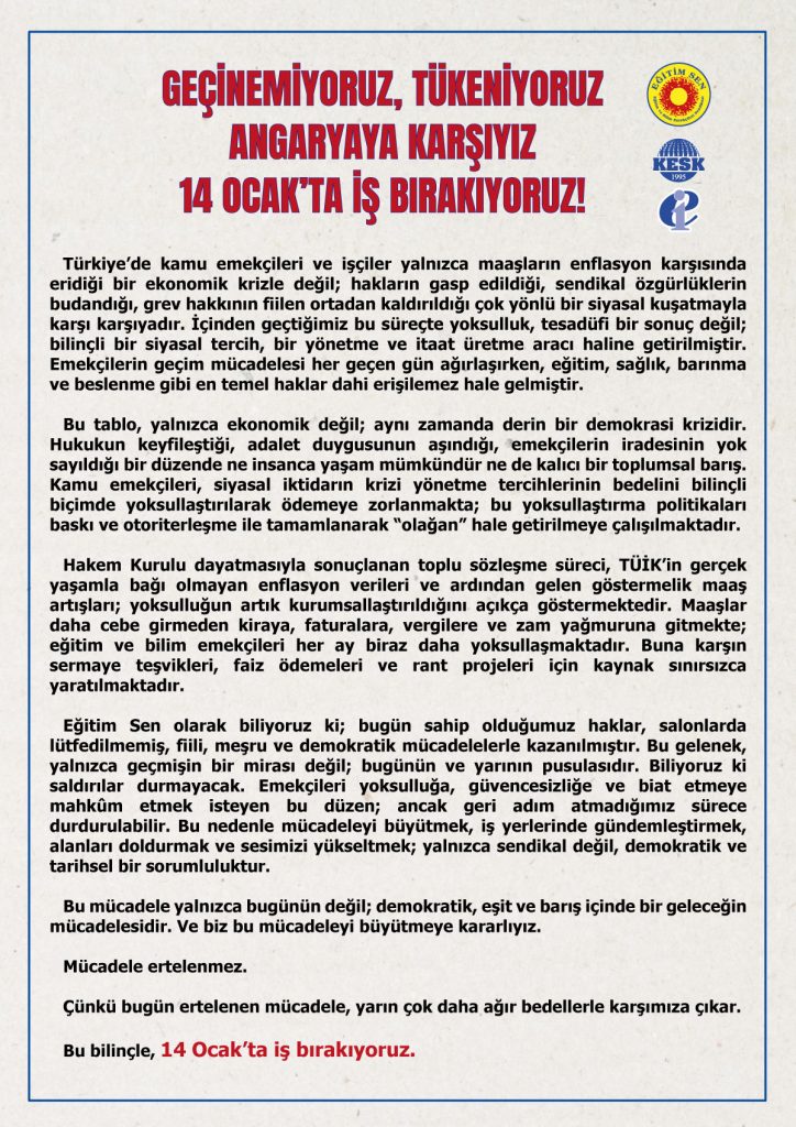 Bildirinin sonunda, hakların masa başında değil, demokratik mücadele ile kazanıldığı hatırlatılarak, tüm eğitim emekçileri 14 Ocak'ta seslerini yükseltmeye ve iş bırakmaya davet edildi.