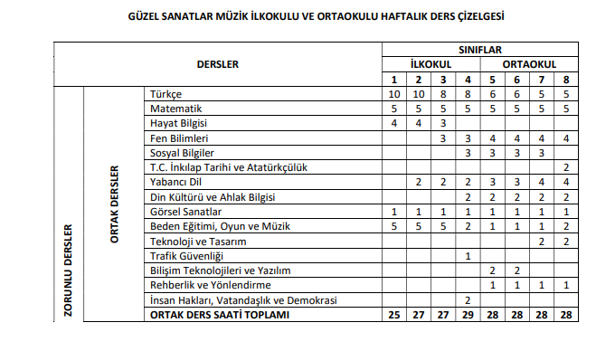 Milli Eğitim Bakanlığı Kasım Ayı Tebliğler Dergisi yayınlandı. Bu kapsamda Millî Eğitim Bakanlığı (MEB), 2025-2026 eğitim ve öğretim yılından itibaren geçerli olmak üzere "Güzel Sanatlar Müzik İlkokulu ve Ortaokulu Haftalık Ders Çizelgesi"nin uygulanmasına yönelik önemli bir karara imza attı. Bir diğer değişiklik ise İmam Hatip Ortaokulu Haftalık Ders Çizelgesi'nde 2025-2026 eğitim ve öğretim yılından itibaren geçerli olmak üzere, ekli örnek doğrultusunda yapıldı. Güzel Sanatlar Müzik İlkokulu ve Ortaokulu Haftalık Ders Çizelgesinde Değişiklik Bu okullardaki haftalık ders saatlerini, derslerin dağılımını ve içerikleri güncellendi. Yeni 2025-2026 eğitim ve öğretim yılından itibaren geçerli olacak. Yapılan Değişikle birlikte Rehberlik ve Kariyer Planlama zorunlu dersi Ortaokul 5.,6. ve 7. sınıflarda 1 saate çıkarıldı. İşte Yeni Çizelgede zorunlu dersler...