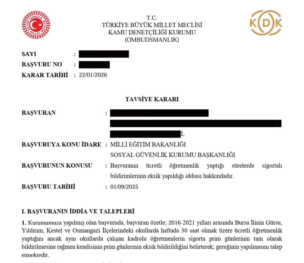 Kamu Denetçiliği Kurumu (KDK), ücretli öğretmenlerin yıllardır süregelen "eksik prim" mağduriyetine son verecek tarihi bir tavsiye kararına imza attı. Karara göre, haftalık belirli ders saatini dolduran ücretli öğretmenlerin sigorta primleri artık "tam süreli çalışma" üzerinden hesaplanacak. Bursa’nın Gürsu, Yıldırım, Kestel ve Osmangazi ilçelerinde 2016-2021 yılları arasında haftalık 30 saat derse giren bir ücretli öğretmenin başvurusu, Türkiye’deki tüm ücretli öğretmenler için yeni bir dönemi başlattı. Kadrolu meslektaşlarıyla aynı sürelerde çalışmalarına rağmen sigorta primlerinin eksik yatırılmasından şikayetçi olan öğretmeni Kamu Denetçiliği Kurumu haklı buldu.