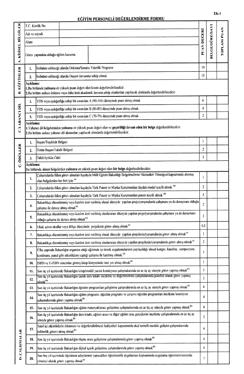 - Bakanlık kadrolarından istihdam edilecek personel, öncelikle Eğitim Personeli Değerlendirme Formu üzerinden değerlendirilecektir.