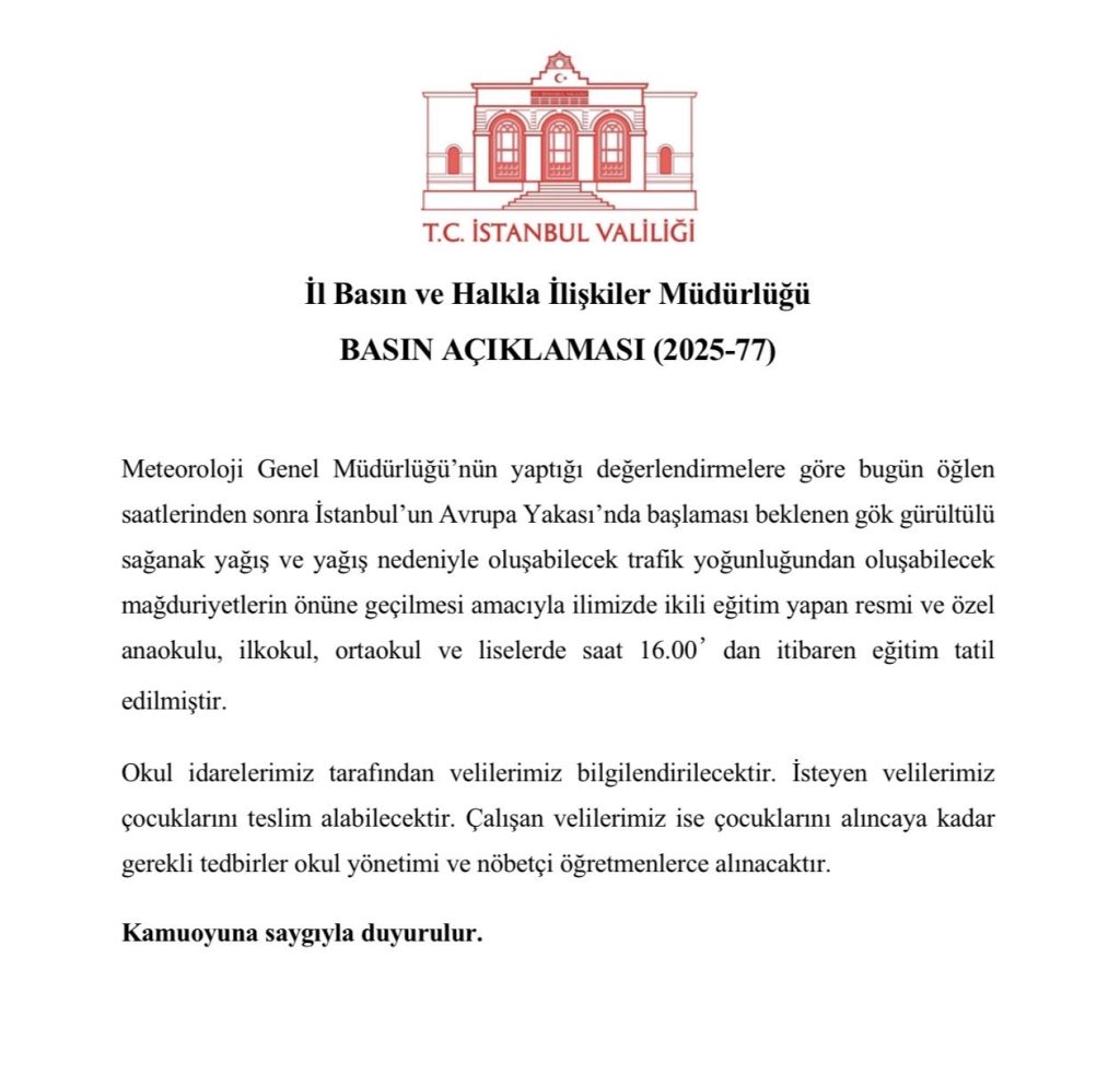 İstanbul Valiliği İl Basın ve Halkla İlişkiler Müdürlüğü’nden yapılan (2025-77) numaralı basın açıklamasına göre, karar, öğleden sonra başlaması beklenen gök gürültülü sağanak yağış ve bu yağışın tetikleyebileceği trafik yoğunluğu nedeniyle oluşabilecek mağduriyetleri önlemek amacıyla alındı.