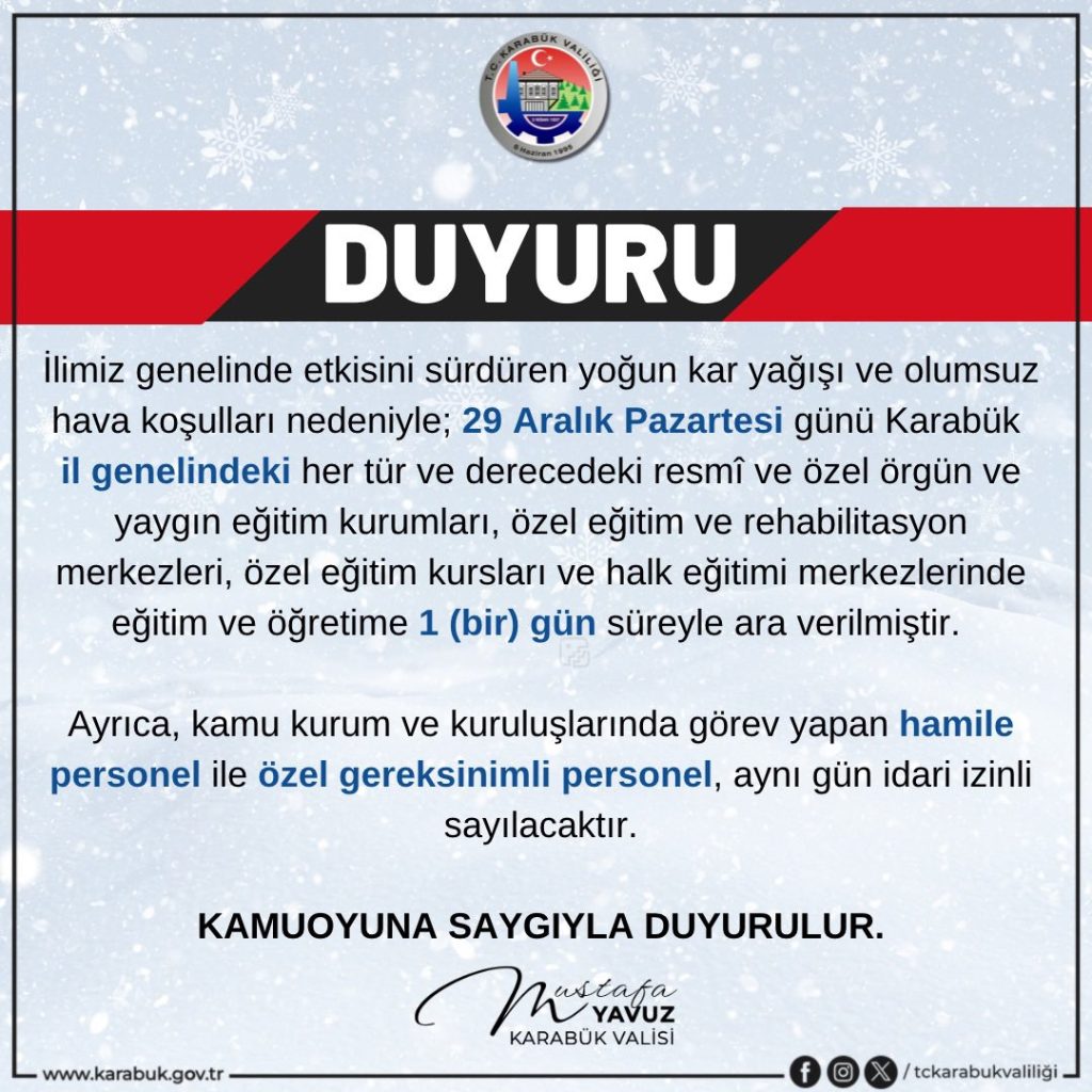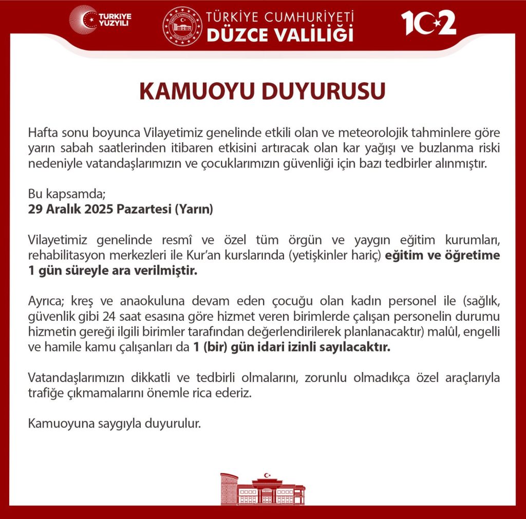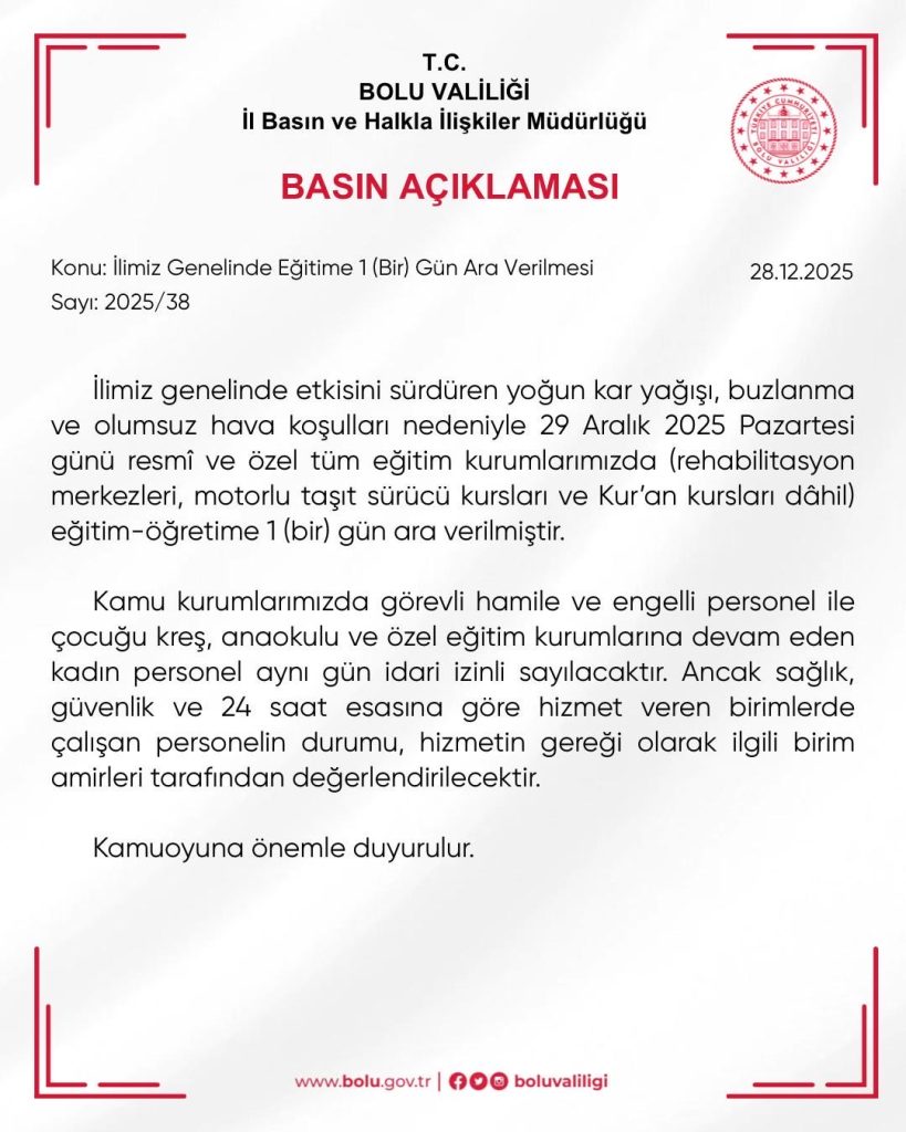 Van Valiliği Açıklaması "KAR TATİLİ Meteoroloji Bölge Müdürlüğümüzle yapılan değerlendirmeler neticesinde, Van'da etkisini sürdüren yoğun kar yağışı, buzlanma ve sis nedeniyle 29.12.2025 Pazartesi günü (yarın) ilimiz geneli resmi/özel tüm örgün ve yaygın eğitim kurumlarında (RAM, Halk Eğitim Merkezleri, Aile Destek Merkezleri ve Rehabilitasyon Merkezleri dahil) eğitim-öğretime 1(bir) gün süreyle ara verilmiştir. Kamu kurum ve kuruluşlarında çalışan engelli ve hamile personelimiz idari izinli sayılacaktır. 0-6 yaş çocuğu olan kamu kurum ve kuruluşlarında çalışan anneler de idari izinli sayılacaktır. Kamuoyuna saygı ve önemle duyurulur." Bolu Valiliği Açıklaması