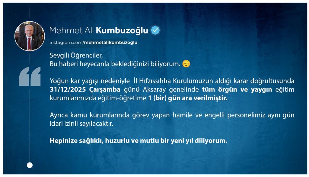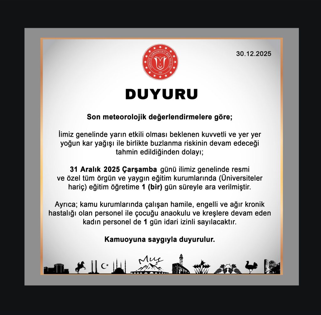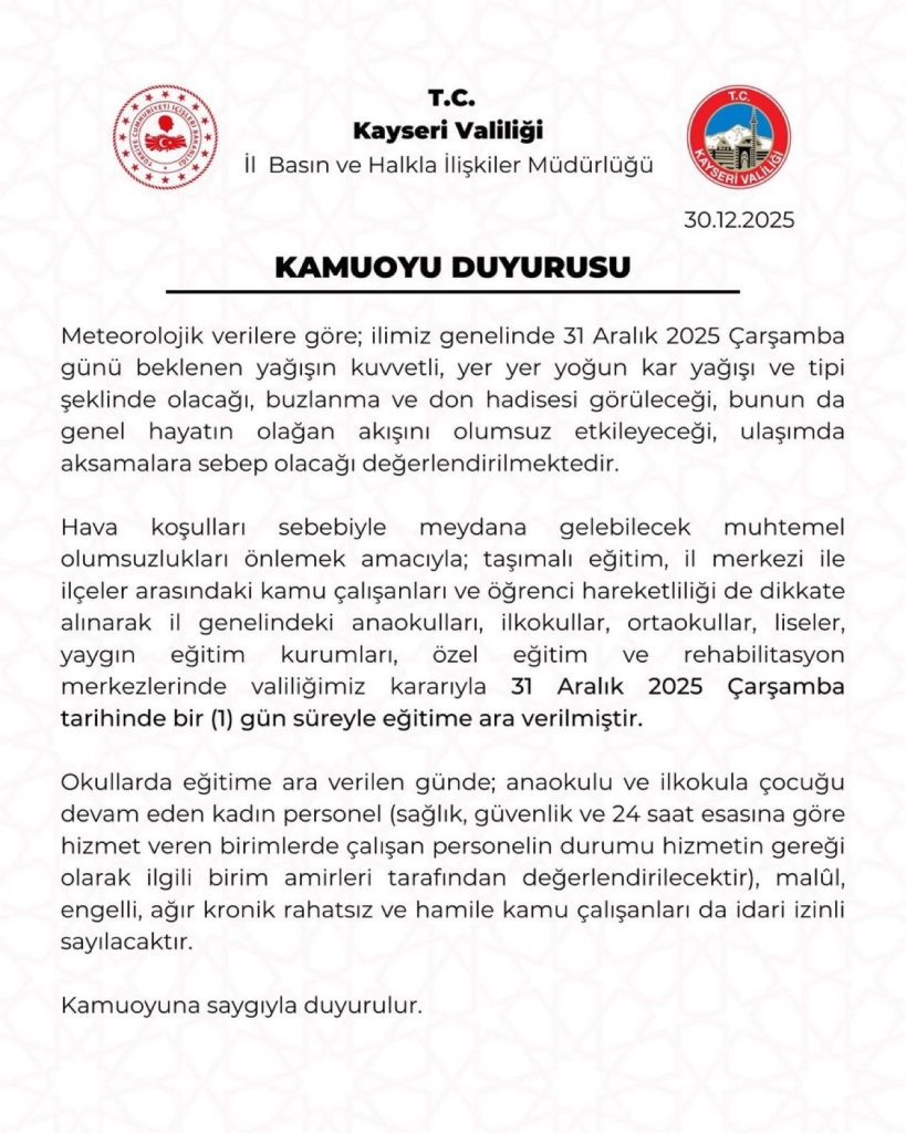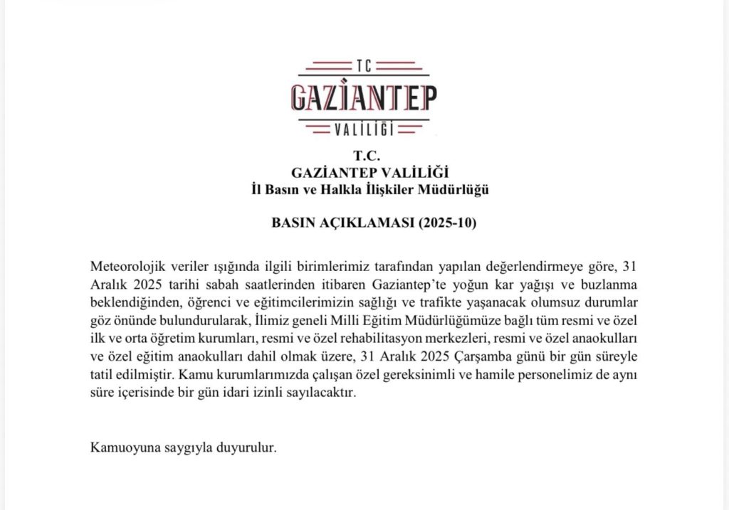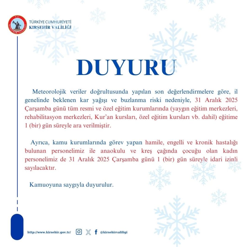 İdari İzin Kararı Çıktı Valiliklerden gelen peş peşe açıklamalarla, kar tatili kapsamı genişletilerek kamu çalışanlarına yönelik idari izin kararı duyuruldu. Olumsuz hava koşullarının ve ulaşım risklerinin artması üzerine alınan karar doğrultusunda; kamu kurumlarında görev yapan engelli, hamile ve malul personel, 31 Aralık tarihlerini kapsayan iki gün boyunca idari izinli sayılacak. Kar Tatili Yılbaşı Tatiliyle Birleşti Valiliklerinden gelen son dakika açıklamalarıyla, kar yağışı nedeniyle verilen zorunlu mola uzadı. Meteorolojik uyarıların ardından alınan 31 Aralık kar tatili kararı, 1 Ocak Yılbaşı resmi tatiliyle birleşince öğrenciler için kesintisiz 2 günlük bir tatil fırsatı doğdu. 20 İlde Eğitime Ara Verildi Batman,