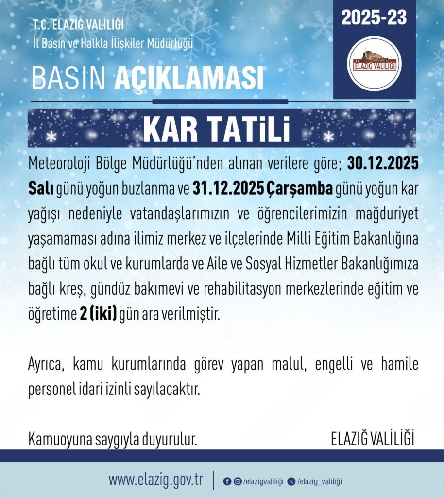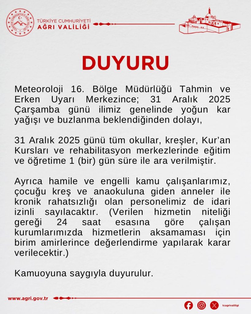 Valiliklerden Peş Peşe Açıklamalar: 31 Aralık Çarşamba 20 İlde Okullar Tatil!