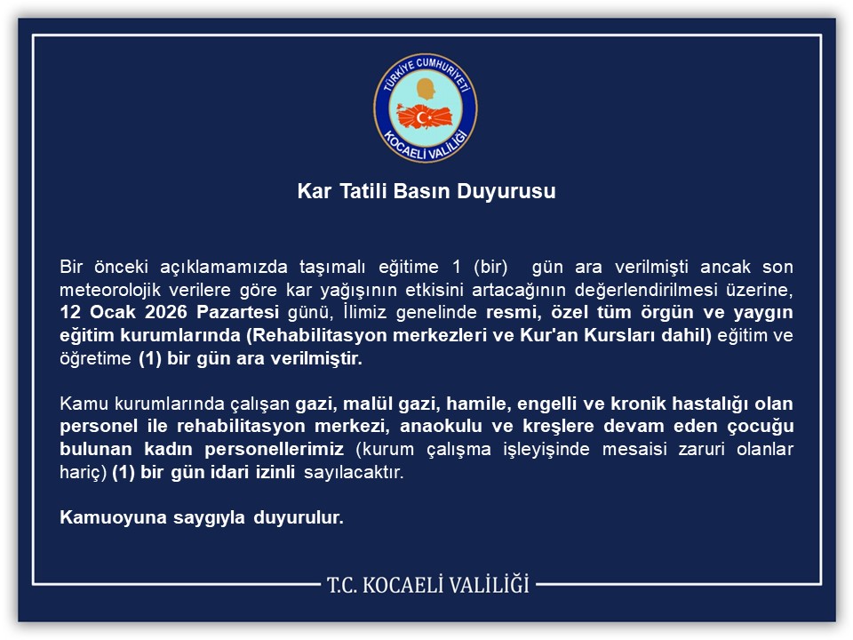 Havaların soğuması ile birlikte tüm yurtta etkisini göstermeye başlayan kar yağışının önümüzdeki hafta boyunca aralıklarla sürmesi bekleniyor. Aşırı kar yağışı, Soğuk hava ve buzlanma sebebiyle günlük hayat olumsuz etkileniyor. Valiliklerden tarafından gün içerisinde yapılan uyarıların ardından kar tatili haberleri de gelmeye başladı. 12 Ocak Pazartesi günü bazı illerde okullar tatil edildi. O illerin listesi haberimizde... Son Dakika Kar Tatili Duyuruları Mebpersonel.com'da olmaya devam edecek.