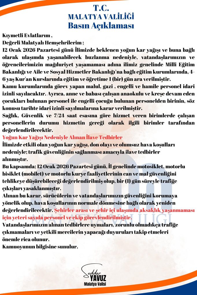 Ankara Valiliği "Yapılan son meteorolojik değerlendirmeler doğrultusunda kırsal mahallelerimizden yapılan taşımalı eğitime bir gün ara verilmesine Valiliğimizce karar verilmiş olup; bunun dışında, İlimiz genelinde eğitim-öğretim faaliyetine devam edilecektir. Kamuoyunun bilgisine sunulur." Yozgat Valiliği Açıklama için