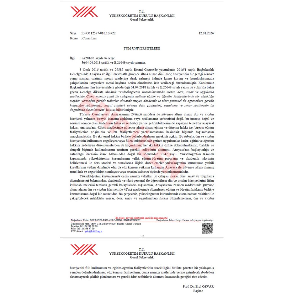 YÖK, üniversitelerde Cuma namazı saatlerine denk gelen ders, sınav ve uygulama saatleri için önemli bir adım attı. Tüm üniversite rektörlüklerine gönderilen resmi yazıda, akademik ve idari personel ile öğrencilerin ibadet hürriyetlerinin engellenmemesi için gerekli kolaylıkların sağlanması istendi. Eğitim Aksamasın, İbadet Engellenmesin Yazıda, 2016 yılında yayımlanan Başbakanlık Genelgesi’ne atıfta bulunularak, kamu kurumlarında Cuma namazı saatinin mesai saatine denk gelmesi durumunda personelin izinli sayılacağı hatırlatıldı. Düzenlemeler Yeniden Gözden Geçirilmeli YÖK Başkanı Prof. Dr. Erol Özvar imzasıyla gönderilen belgede, üniversite yetkili kurullarının ders programlarını ve akademik takvimi belirlerken temel hak ve özgürlükleri sınırlamayacak bir yaklaşım sergilemesi gerektiği belirtildi. Yazı, eğitim faaliyetlerinin sürekliliğini bozmadan, Cuma namazı vaktine denk gelen çalışmaların planlı bir şekilde yeniden değerlendirilmesi ricasıyla son buldu. İşte o yazı