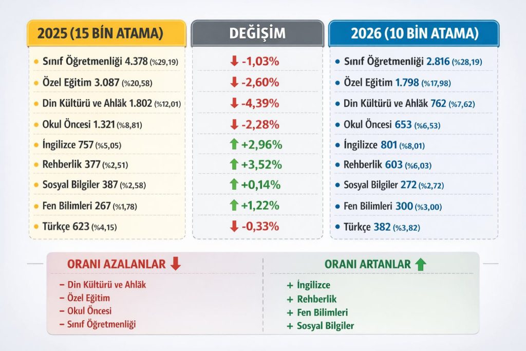 Verilere göre, oransal olarak en büyük kaybı Din Kültürü ve Ahlak Bilgisi branşı yaşıyor. 2025'te toplam atamanın %12,01'ini alan branş, 2026'da %7,62'ye gerileyerek %4,39'luk bir düşüş kaydetti.